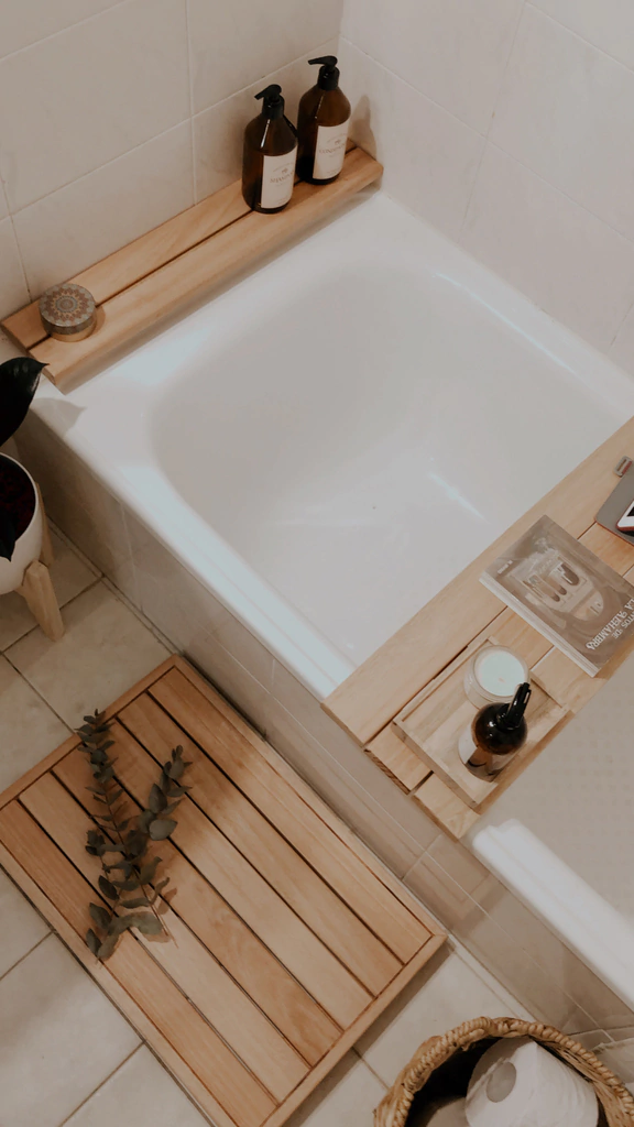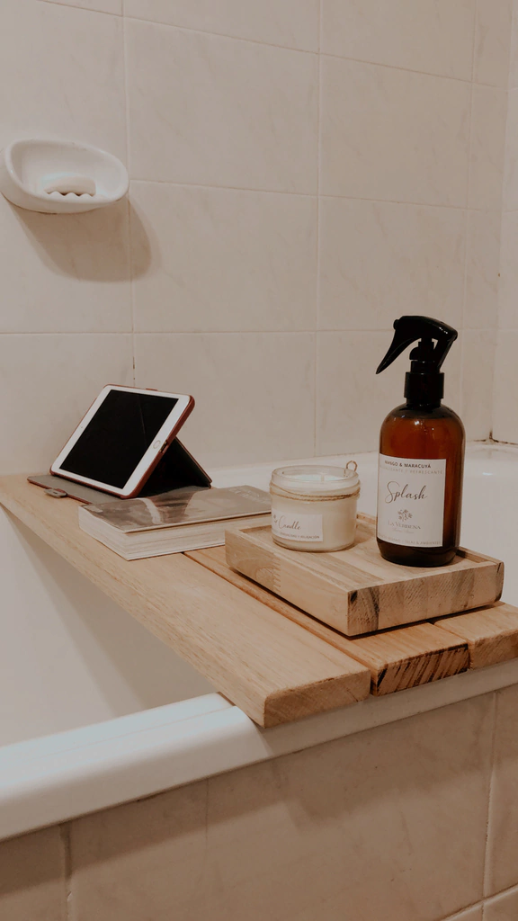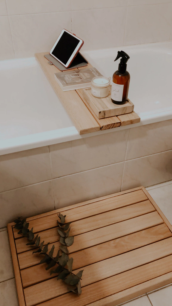 Todo en madera de eucalipto hidrolaqueada. Se puede mojar sin problemas, no se daña ni desgasta el material.